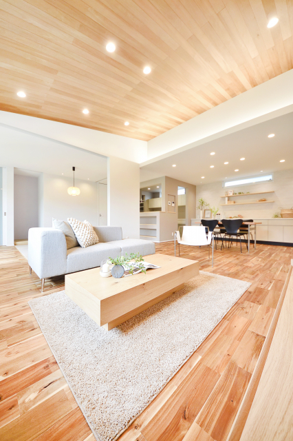 床や、平屋ならではの屋根形状を活かした開放的な勾配天井にも無垢材を使用し 木に囲まれた心地の良い一邸!生活感を感じさせない独立したキッチンや、ホテルのようなストレスフリーの生活動線にもこだわりました。