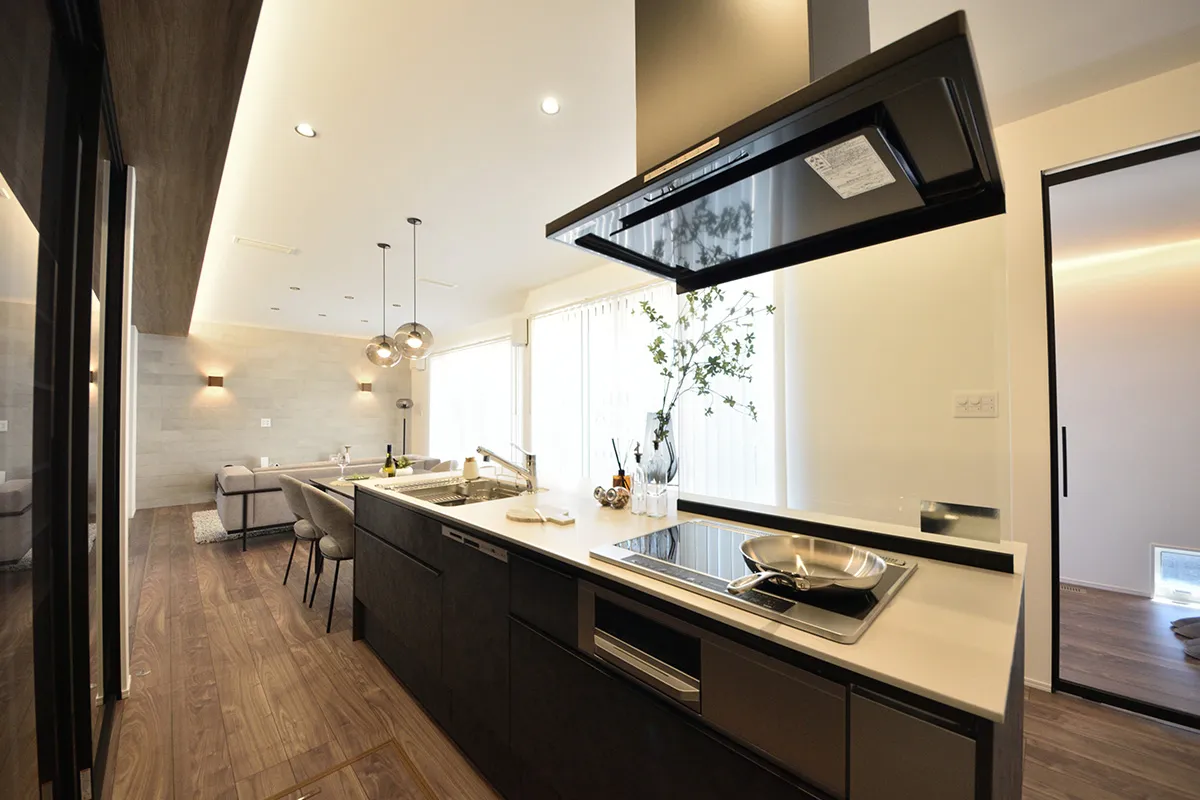 人造大理石のフルフラットキッチンは、美しさと使いやすさを両立。2段式シンクで作業もスムーズに、毎日の料理がもっと快適になります。