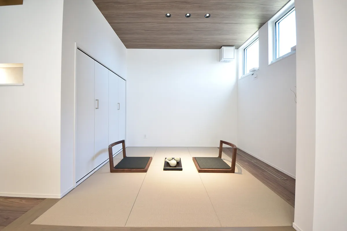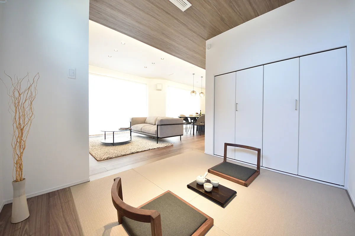 1階の和室は、ほっと一息つける心地よいスペース。お昼寝や勉強、趣味の時間など、自由に使える柔軟な空間です。