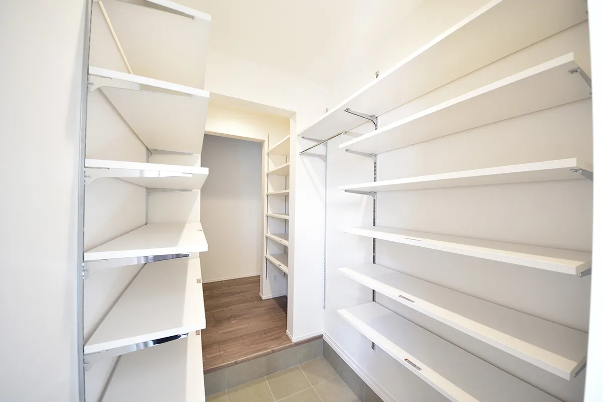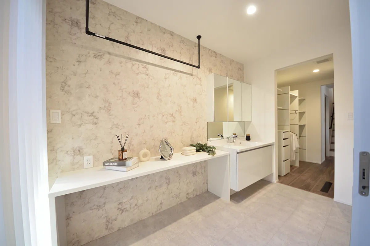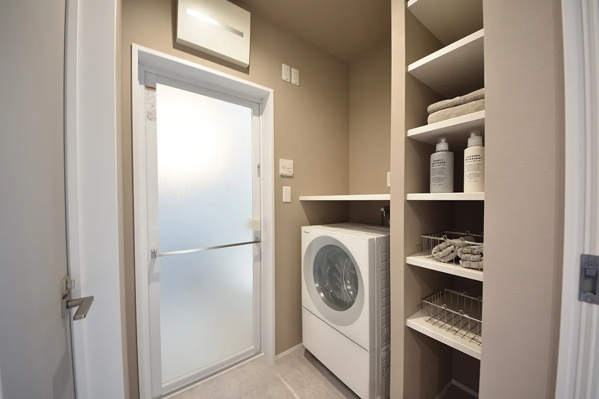 家事動線を考えたランドリールームは、洗う・干す・片付けるを一連で完結。デッキとつながる開放的な設計で、外干しも気持ちよく行えます。