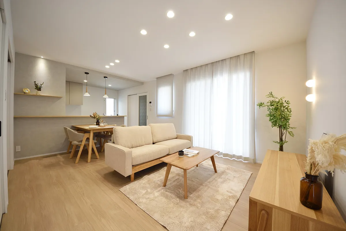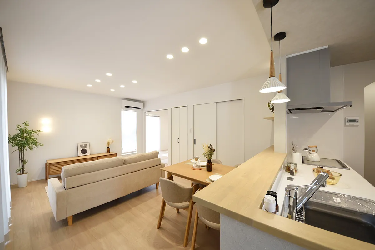 やわらかな木目と柔らかな光が調和した、ナチュラルモダンなリビングダイニング。自然と会話が生まれる、家族が心地よく過ごせる空間です。