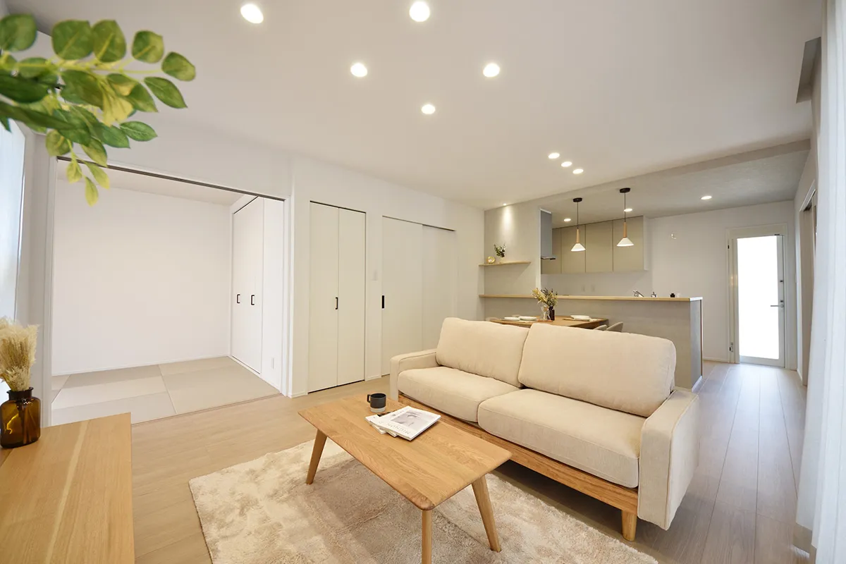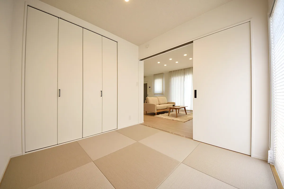 リビング続きの畳ルームは、くつろぎや客間など多目的に使える便利な空間。ゆったりとした時間を過ごしたり、ひと息つく場としても最適です。