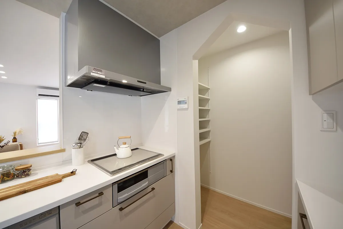 セミオープンキッチンは、リビングとつながりながらも程よく独立したつくり。会話を楽しみながら、落ち着いて料理ができる空間です。