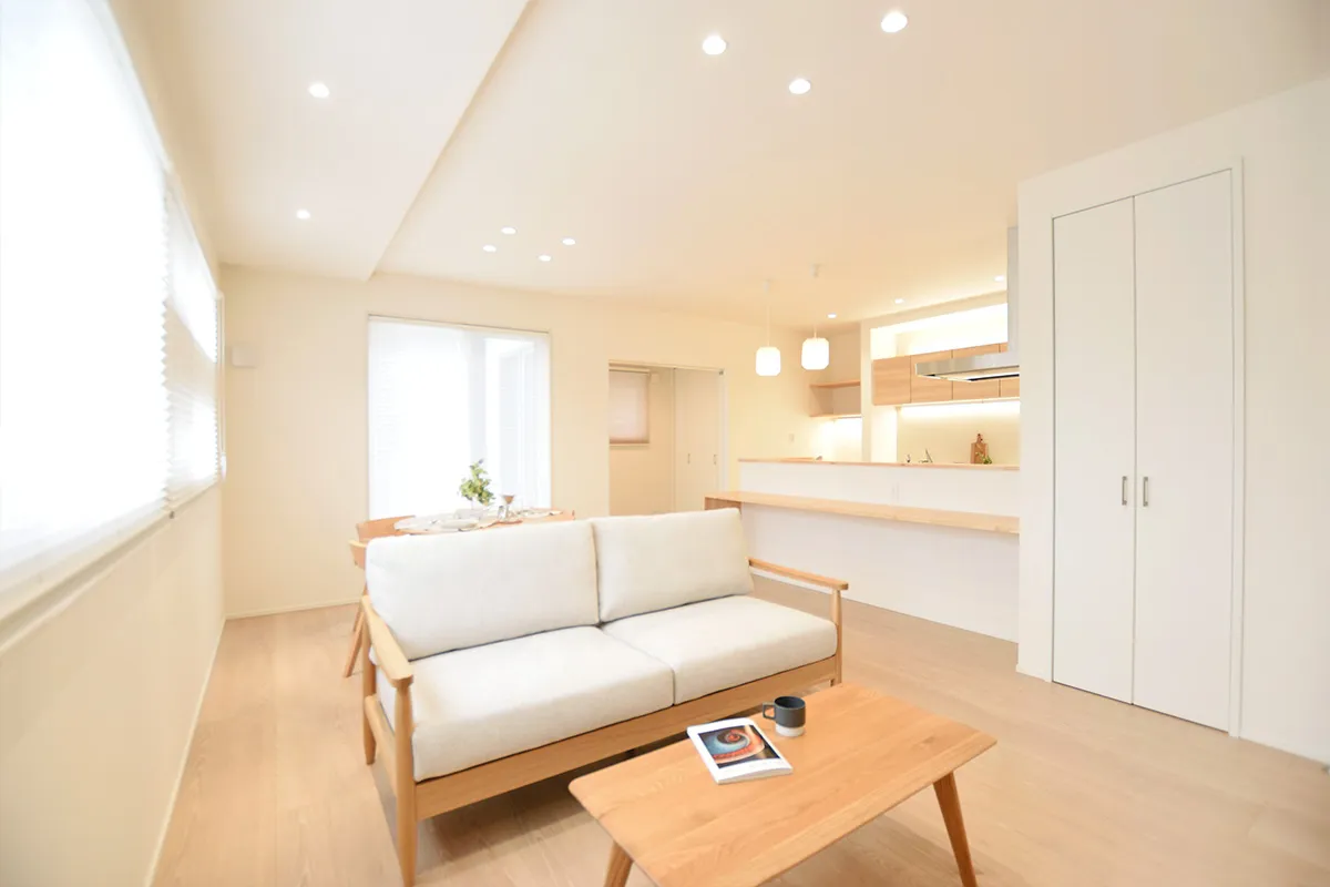 木目の美しさが引き立つ、ナチュラルで洗練されたLDK。光が差し込み、家族の時間を心地よく包み込む、落ち着きと開放感あふれる空間です。