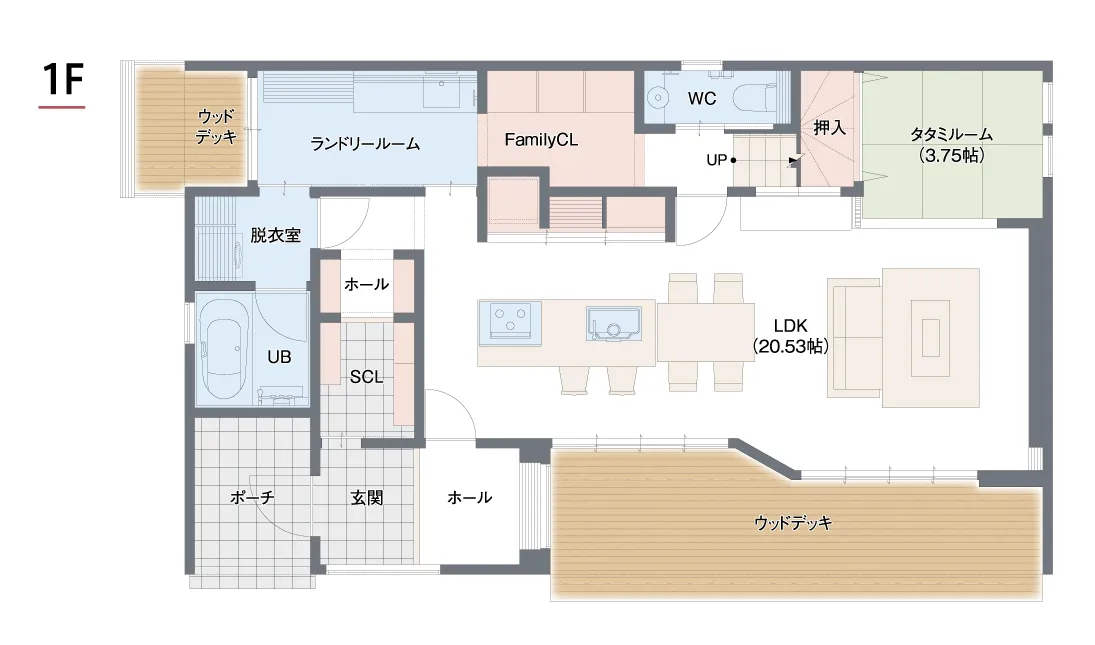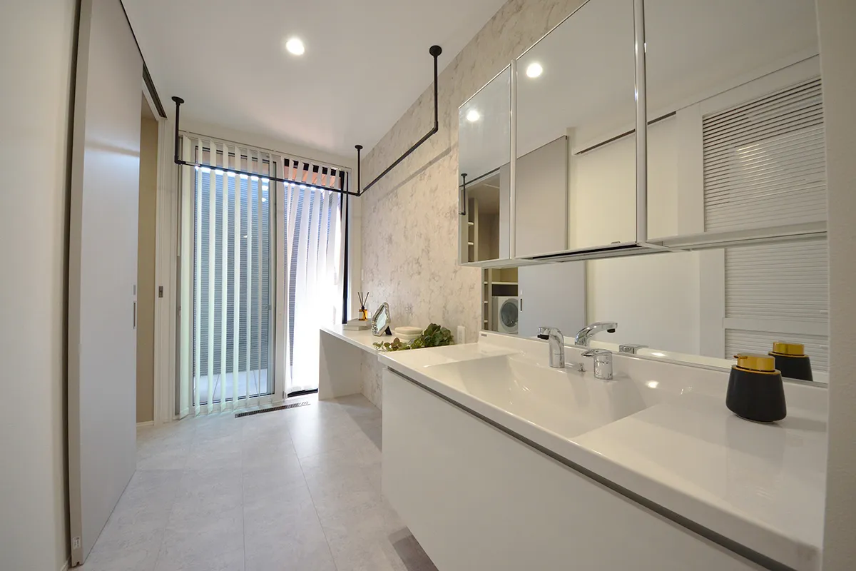 家事動線を考えたランドリールームは、洗う・干す・片付けるを一連で完結。デッキとつながる開放的な設計で、外干しも気持ちよく行えます。