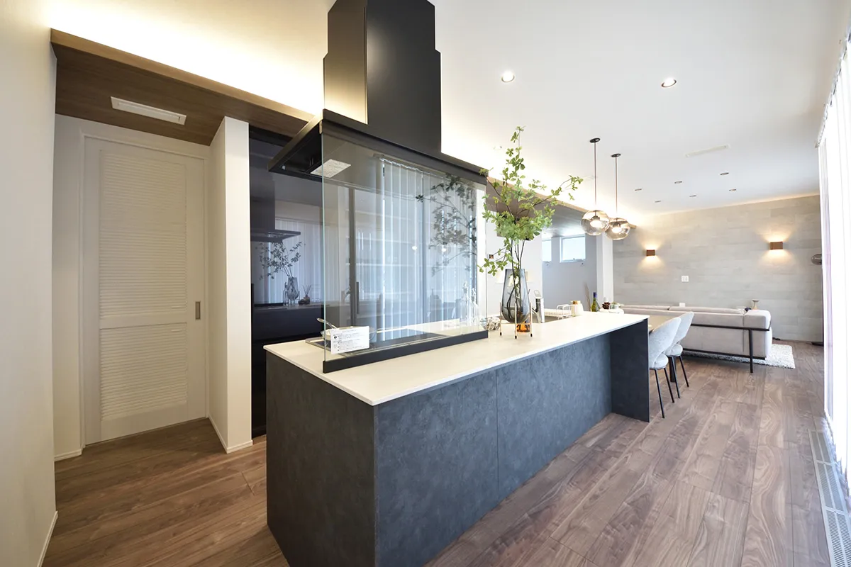 人造大理石のフルフラットキッチンは、美しさと使いやすさを両立。2段式シンクで作業もスムーズに、毎日の料理がもっと快適になります。