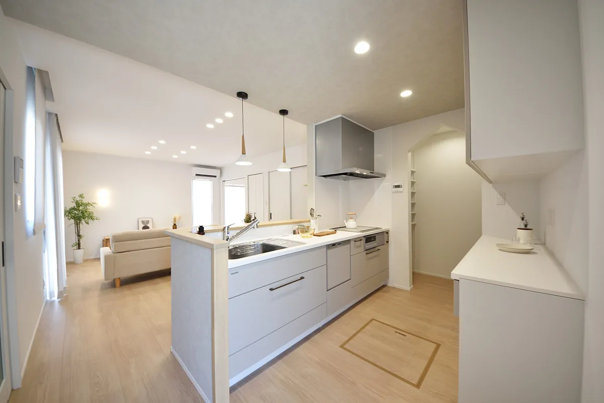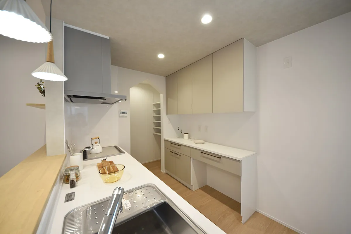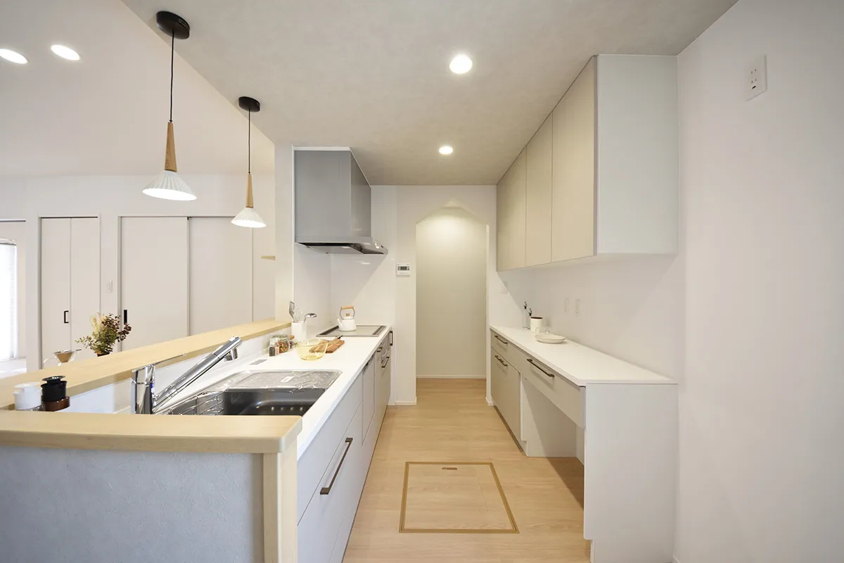 セミオープンキッチンは、リビングとつながりながらも程よく独立したつくり。会話を楽しみながら、落ち着いて料理ができる空間です。