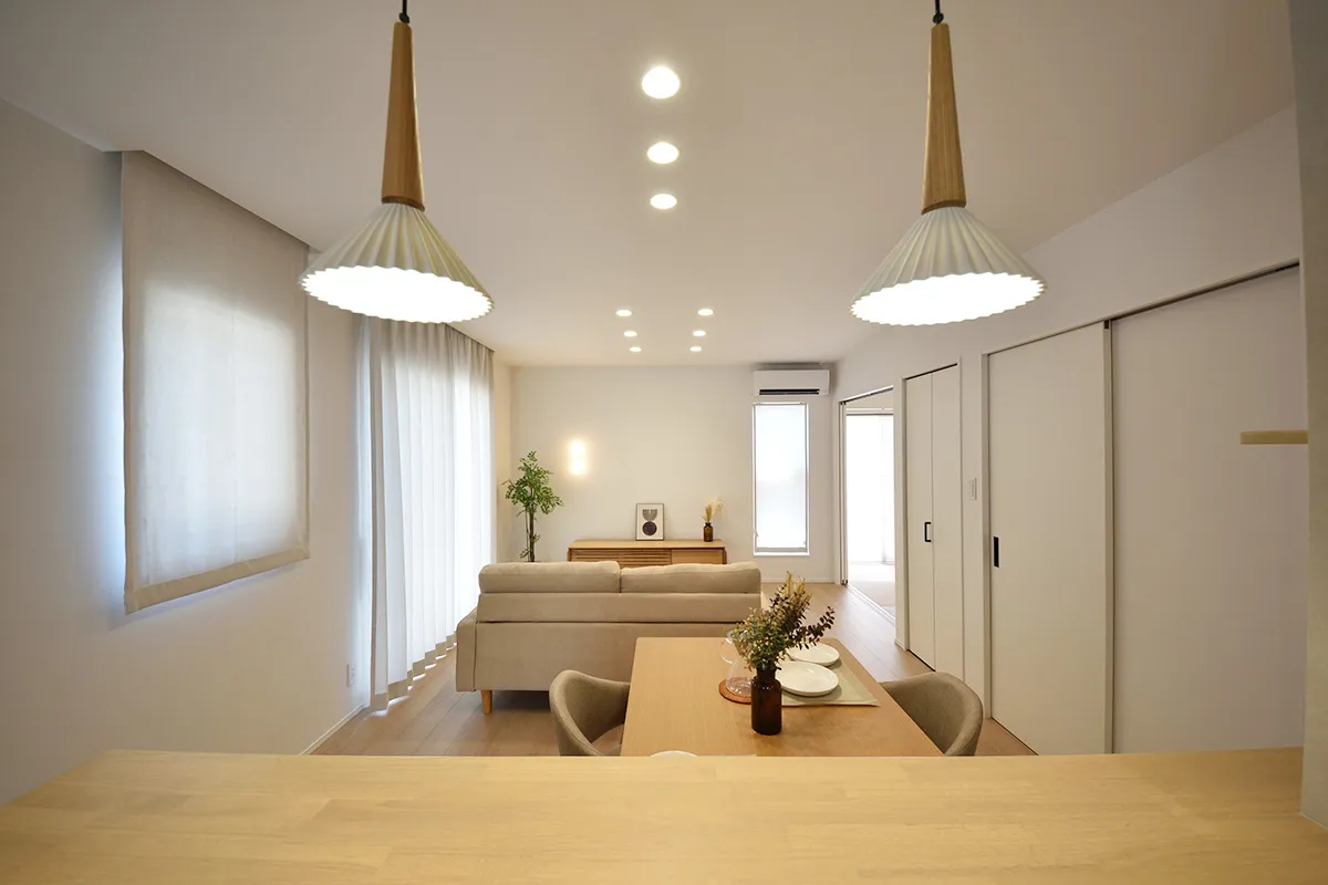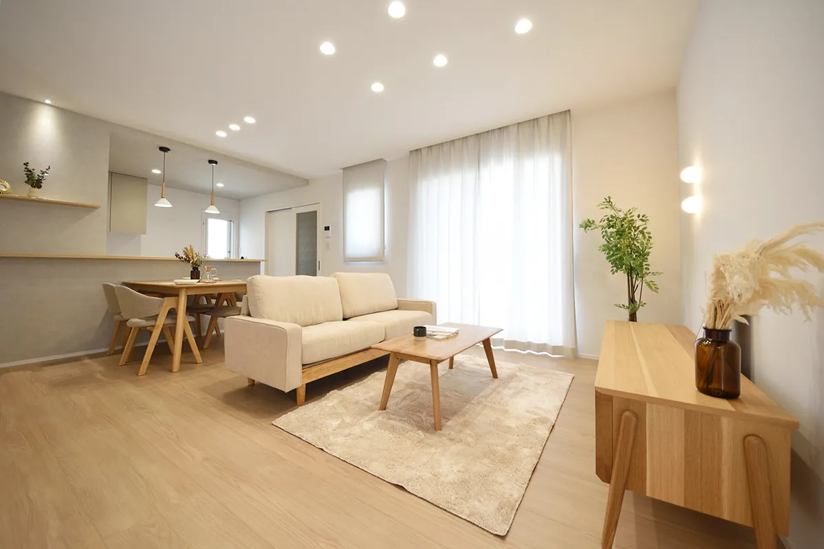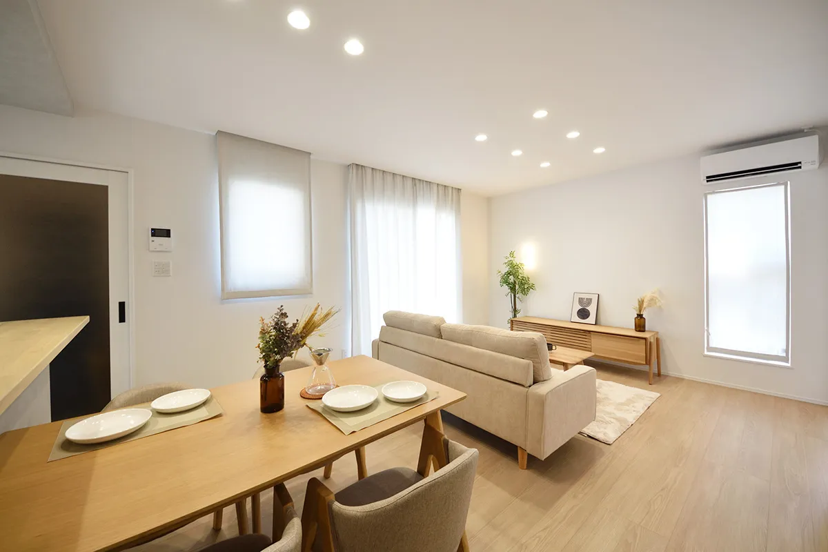 やわらかな木目と柔らかな光が調和した、ナチュラルモダンなリビングダイニング。自然と会話が生まれる、家族が心地よく過ごせる空間です。