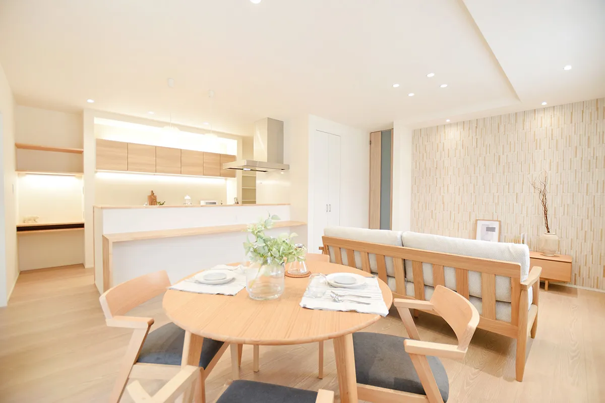 木目の美しさが引き立つ、ナチュラルで洗練されたLDK。光が差し込み、家族の時間を心地よく包み込む、落ち着きと開放感あふれる空間です。