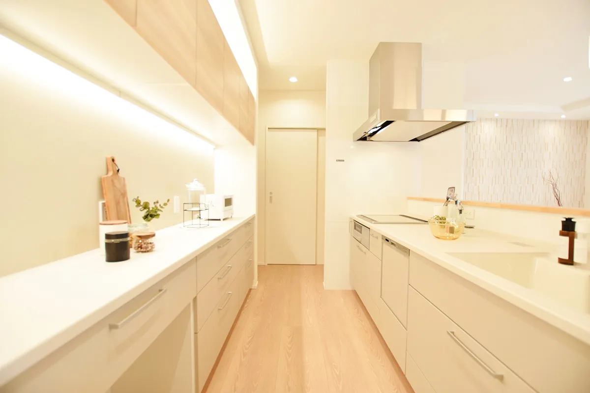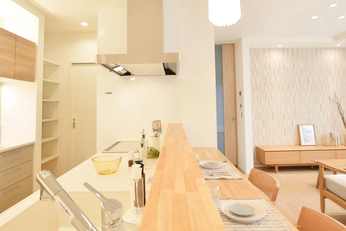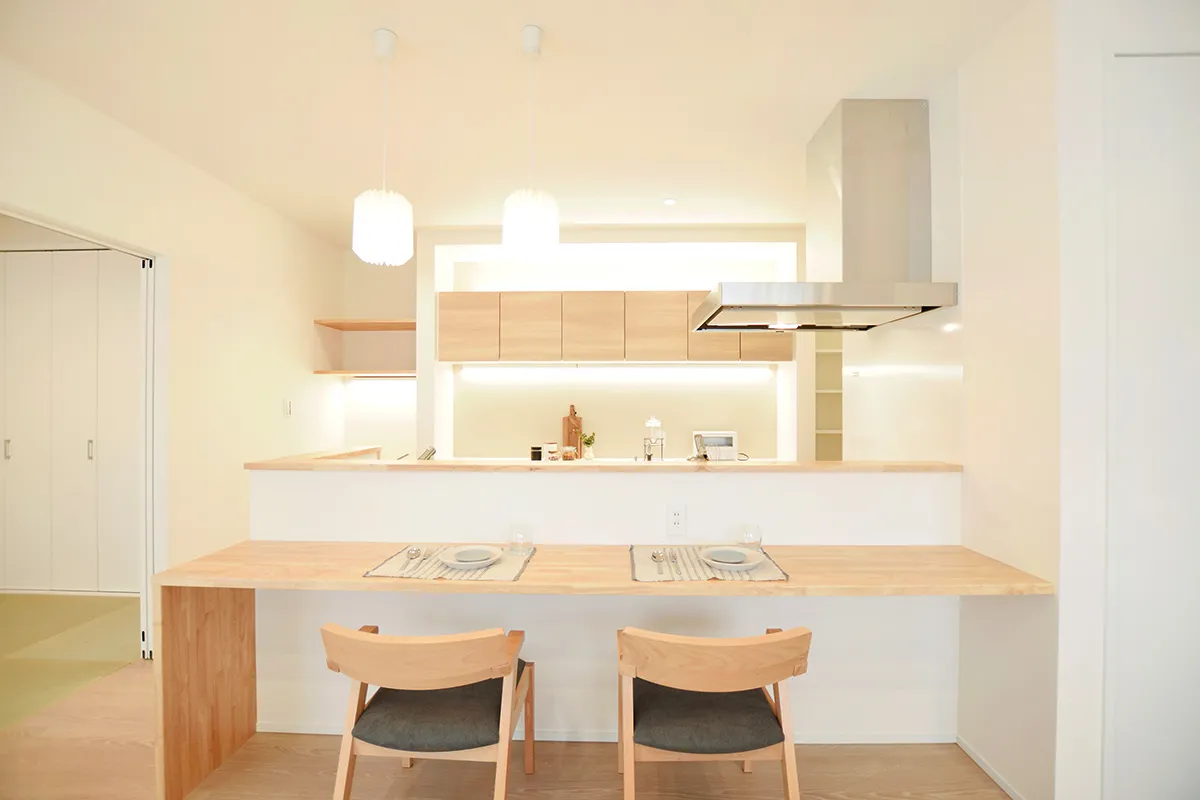 キッチンとつながるカウンターダイニングは、作業や配膳がスムーズに流れる設計。家族との会話も弾み、食事やおやつの時間がより快適で心地よい空間になります。